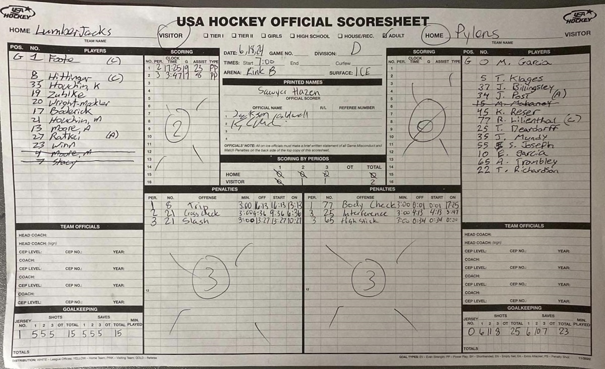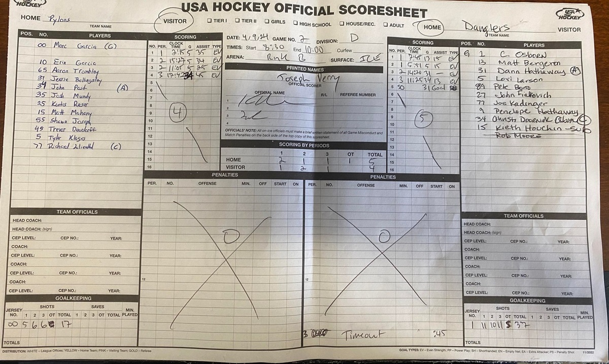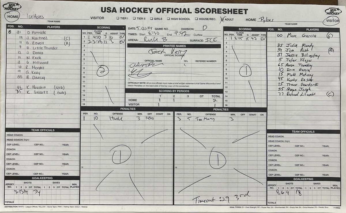 Champs: Pawned Stars8 2 0 0 16 10 27 16 Iceholes 7 3 0 0 14 10 40 26 Rebels 6 3 1 0 13 10 37 31 Lumberjacks 5 5 0 0 10 10 31 36 Danglers 3 6 1 0 7 10 26 41 Pylons 1 8 1 0 3 10 21 32 Date Home Team Away Team Location Scoring/Clock Results 2024-04-09 07:00 PM Lumberjacks Rebels Toyota Arena Joey Perry 2 - 5