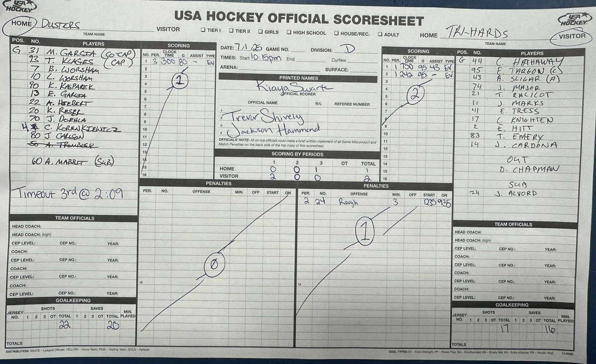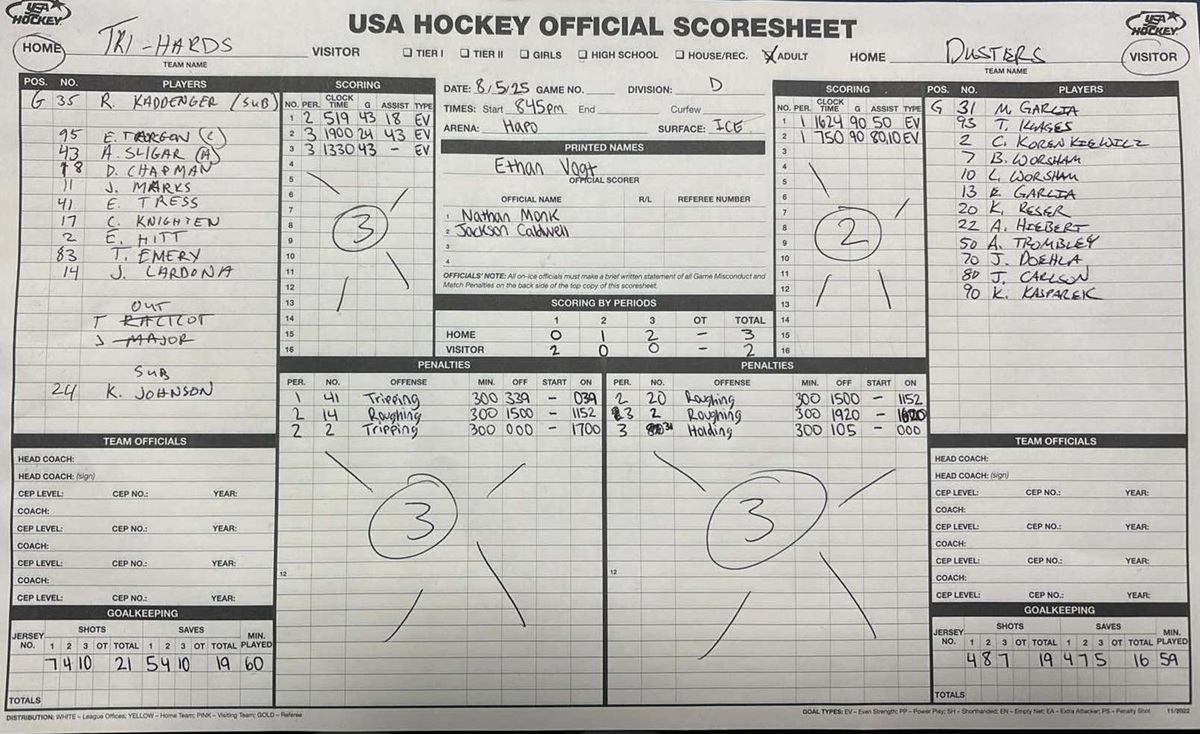 2025-07-01 10:15 PM Dusters Tri-Hards Hapo Ice Pavillion Joey Perry 1 - 2
