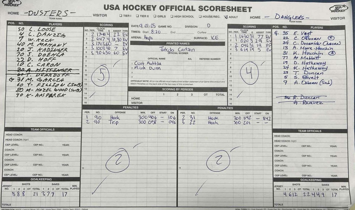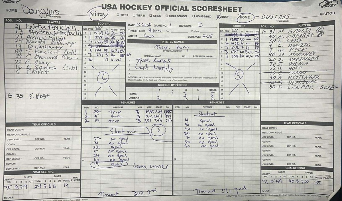 2025-10-21 09:00 PM Dusters Danglers Hapo Ice Pavillion Joey Perry 5 - 6 SO