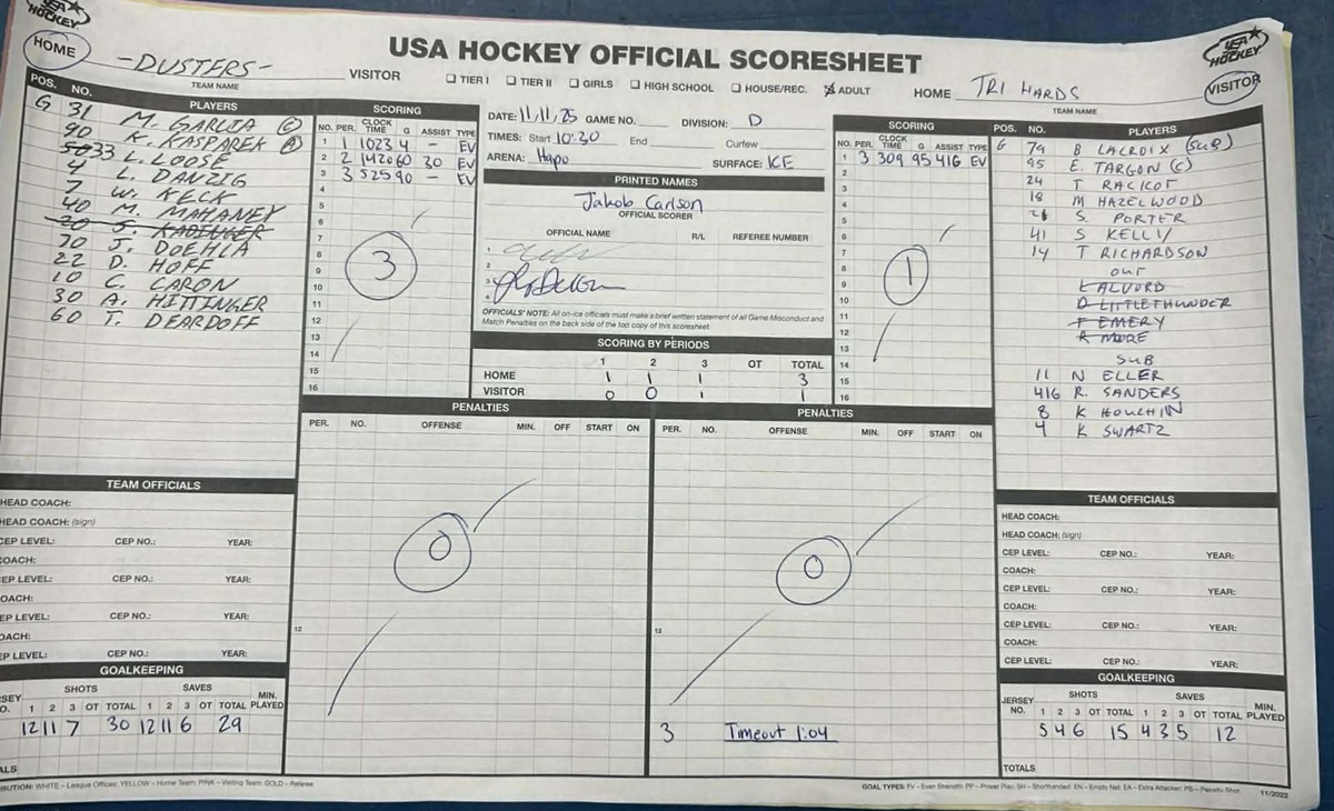 2025-11-11 10:30 PM Dusters Tri-Hards Hapo Ice Pavillion Jakob Carlson 3 - 1